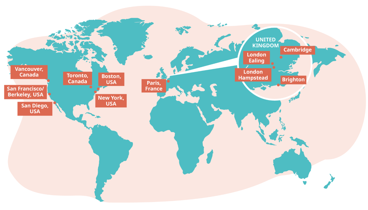 สหราชอณาจักร (United Kingdom) เมือง Brighton เมือง Cambridge เมือง London มี 3 สาขา คือ Central London, Ealing, Hampstead
