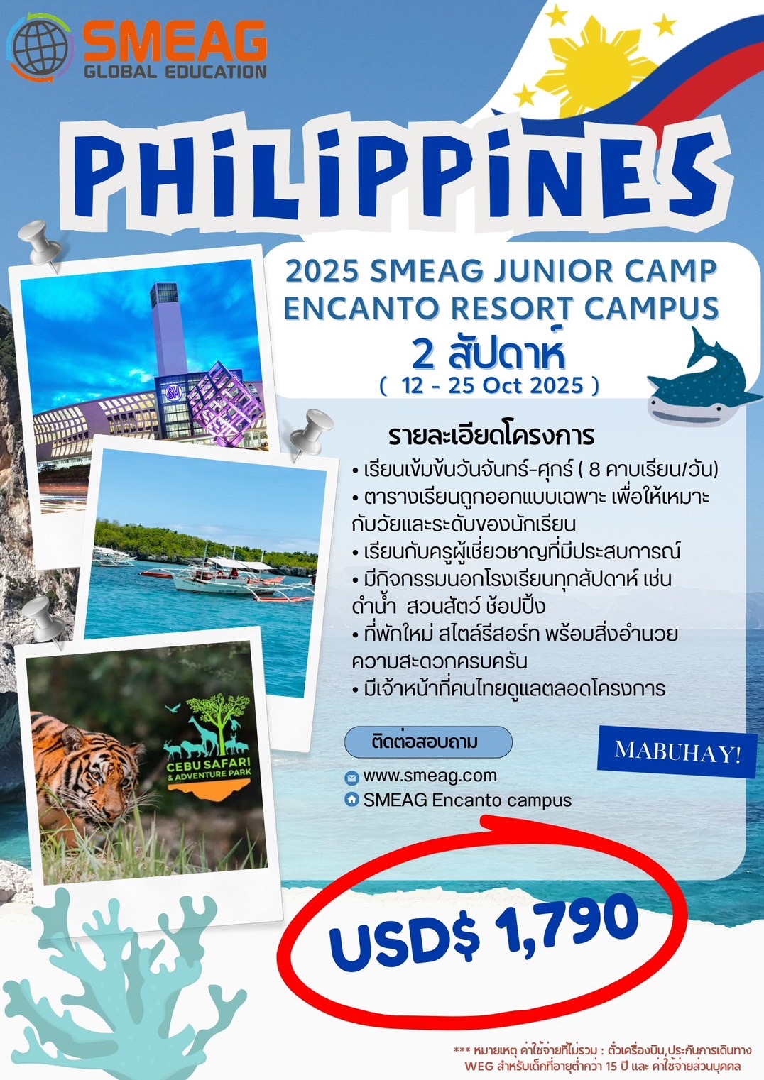 โครงการซัมเมอร์แคมป์ สำหรับน้องๆเยาวชน ช่วงปิดเทอม (Summer 2025) ที่เมืองเซบู ประเทศฟิลิปปินส์ ของสถาบันสอนภาษาชั้นนำ อย่างโรงเรียน SMEAG เป็นโครงการซัมเมอร์ที่จัดขึ้นอย่างต่อเนื่องเป็นประจำทุกปี โดยจะมีน้องๆเยาวชน จากหลากหลายประเทศทั่วโลก เข้าร่วมโครงการซัมเมอร์แคมป์นี้ น้องๆ จะได้รับประสบการณ์ สังคมนานาชาติ และทำความรู้จักแลกเปลี่ยนวัฒนธรรมกับเพื่อนต่างชาติหลากหลายเชื้อชาติ